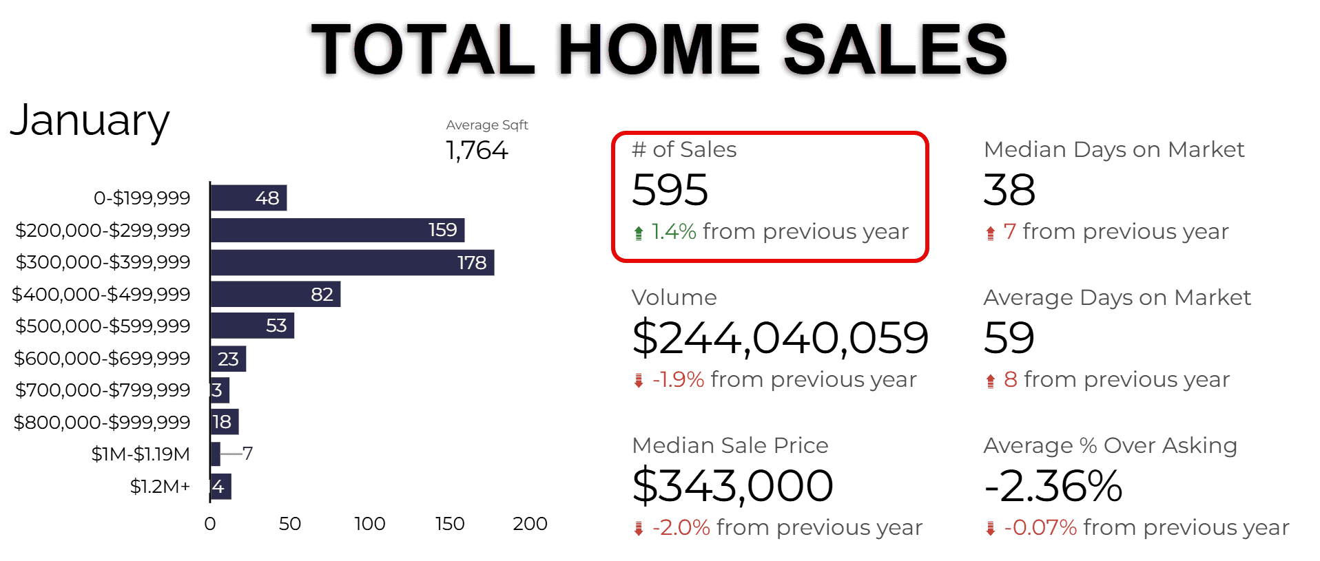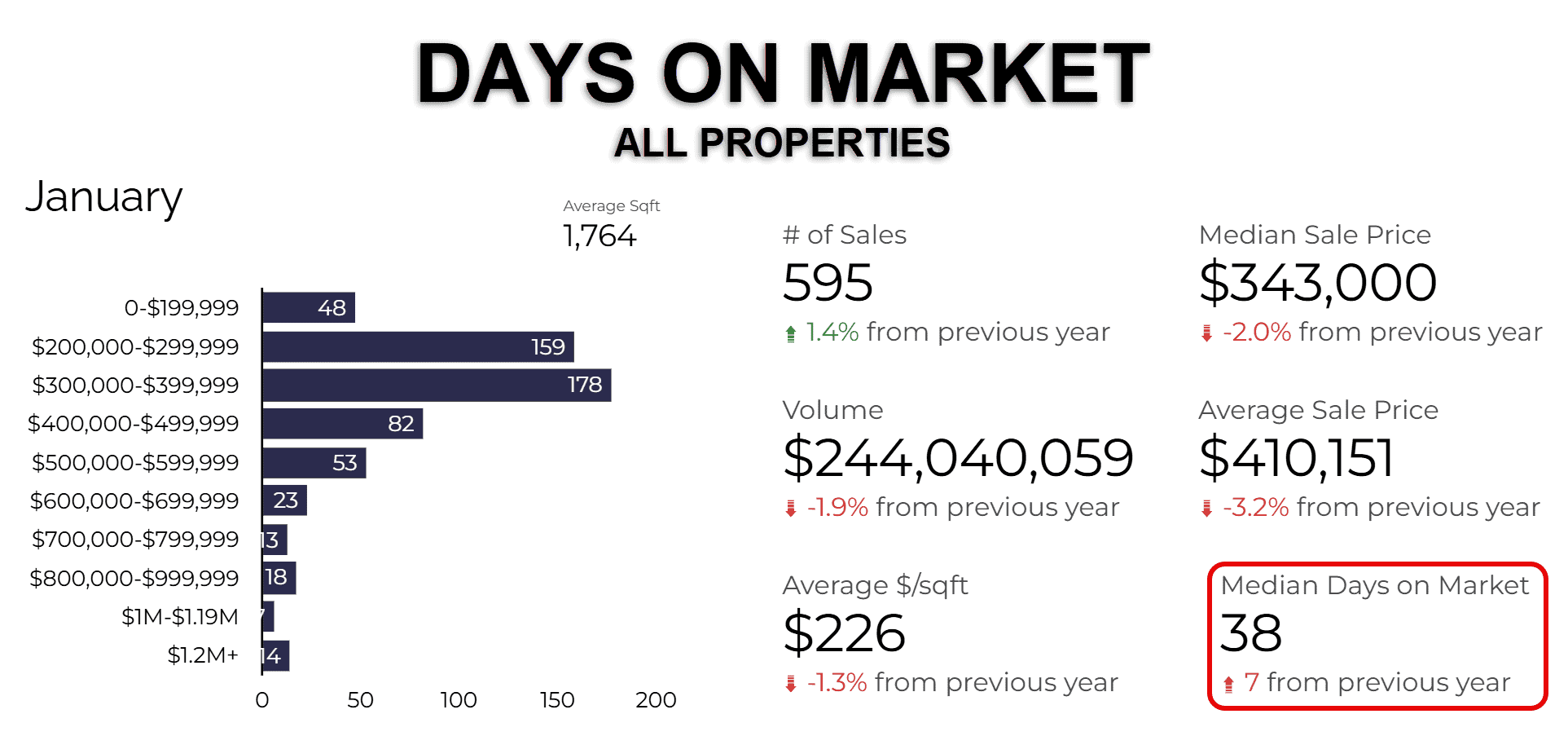 Days on Market for all properties was 38 days, up 7 days from the previous year.