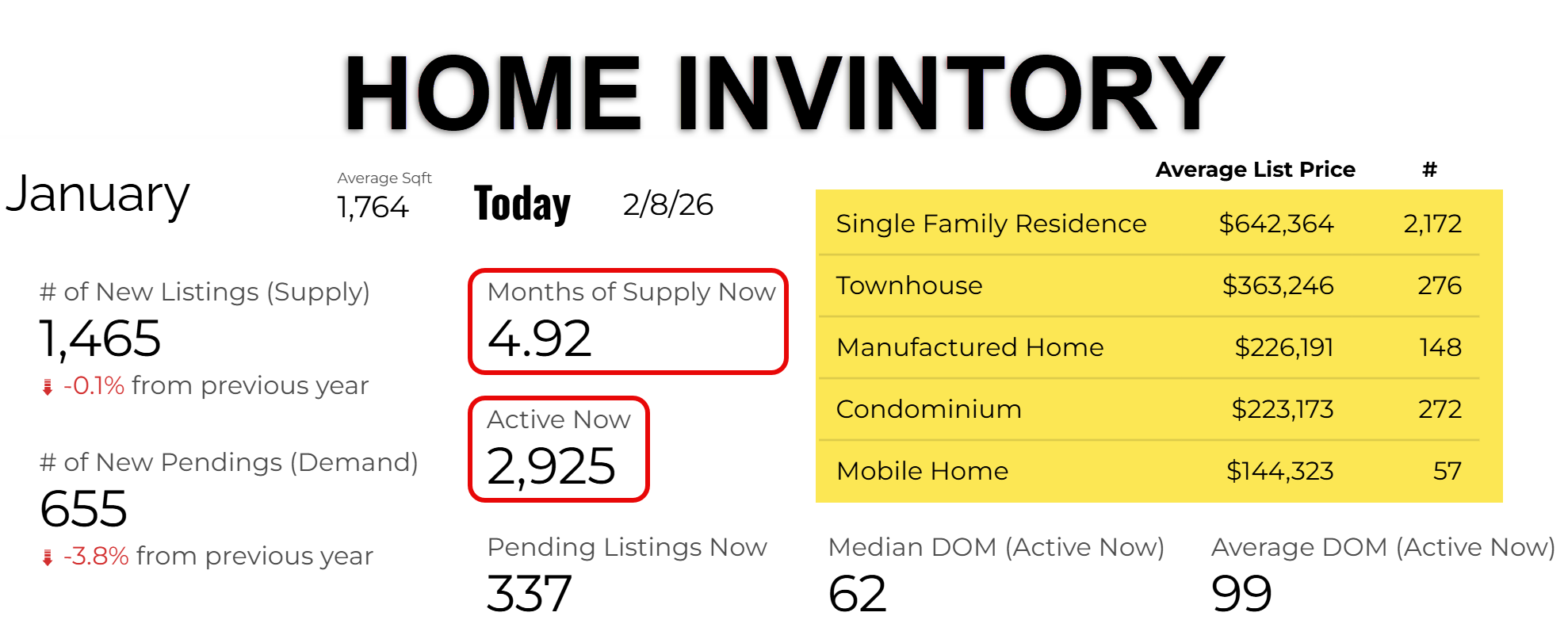 There were 2,925 active listings on the market in January 2026. This increase in inventory has pushed the months of supply to 4.92 months, moving the market toward a more balanced state and giving buyers more options to choose from.
