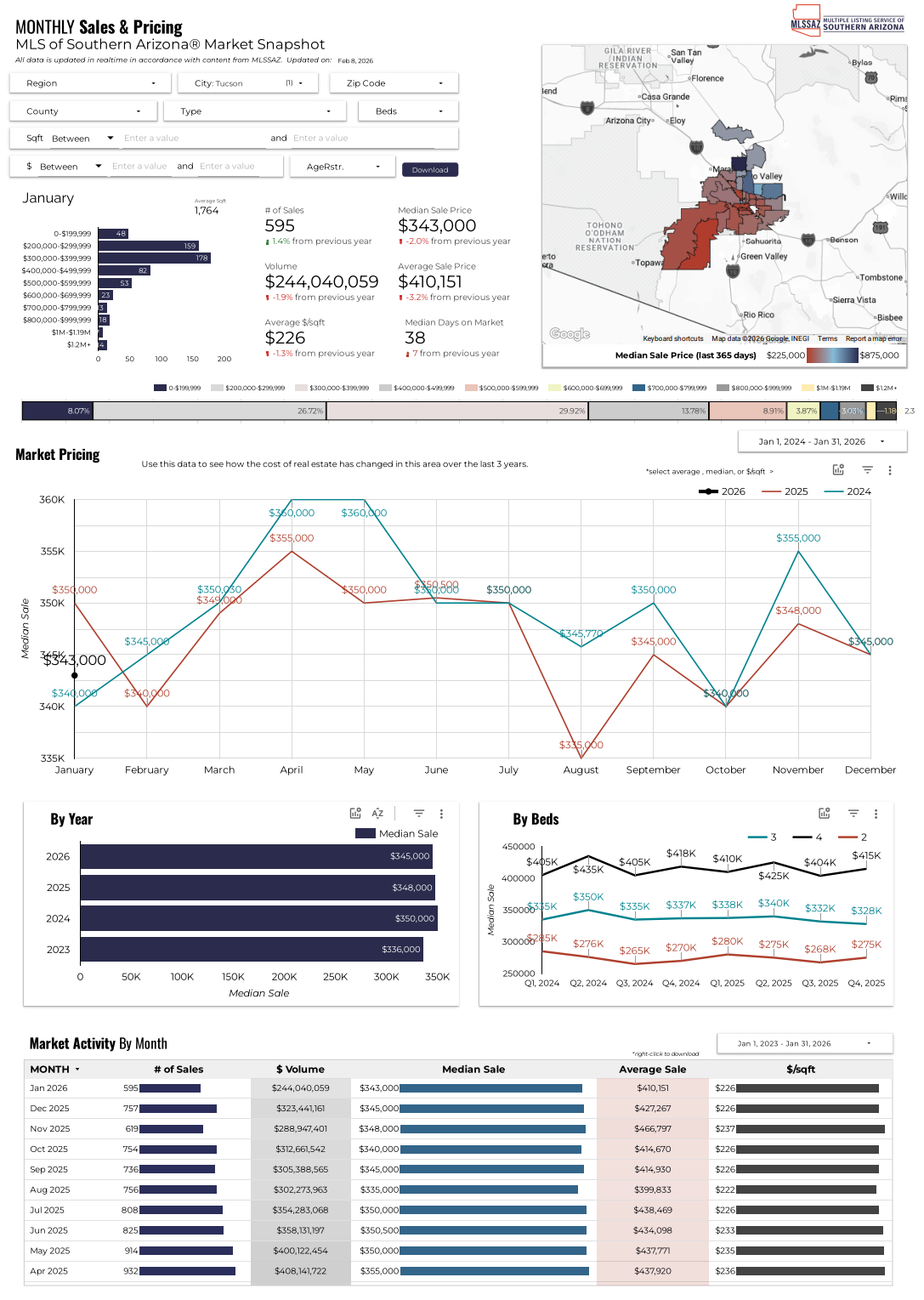 For January 2026, the average price per square foot was $226, a slight decrease of 1.3% compared to last year. This metric is a key indicator for buyers looking to compare value across different Tucson neighborhoods.